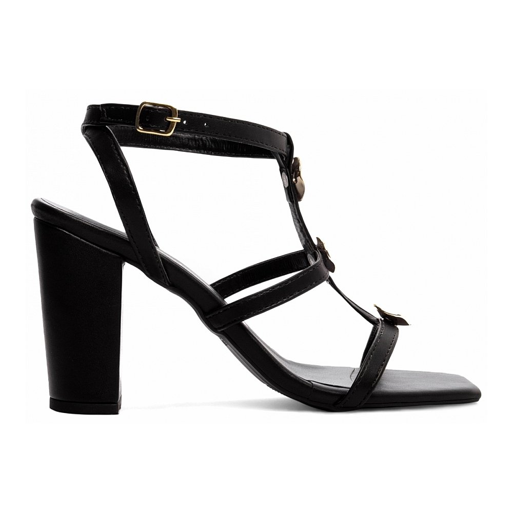 Sandália Salto Grosso 9cm em Napa Preta com Detalhes Dourados – Conforto e Elegância