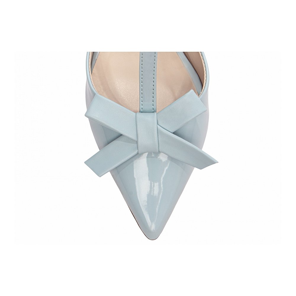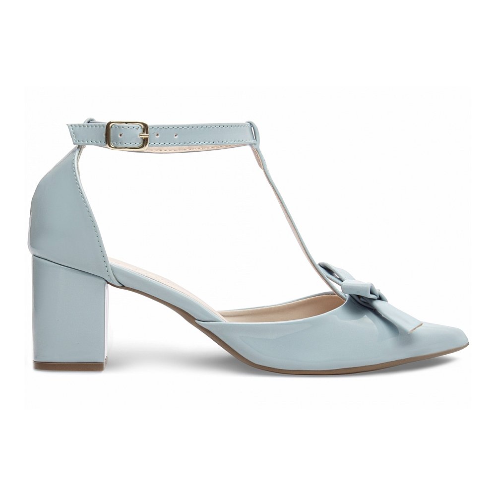 Scarpin Azul Verniz Feminino com Laço, Salto Grosso Confortável